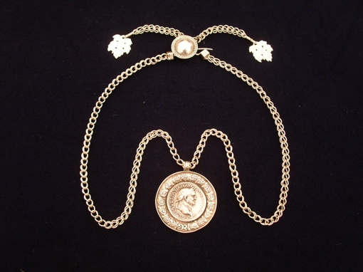 Rekonstruktion einer Kette aus Pompeji. Anstatt einer gefassten Münze ist die Kette im Original mit einem kleinen Lunula-Anhänger ausgestattet. |